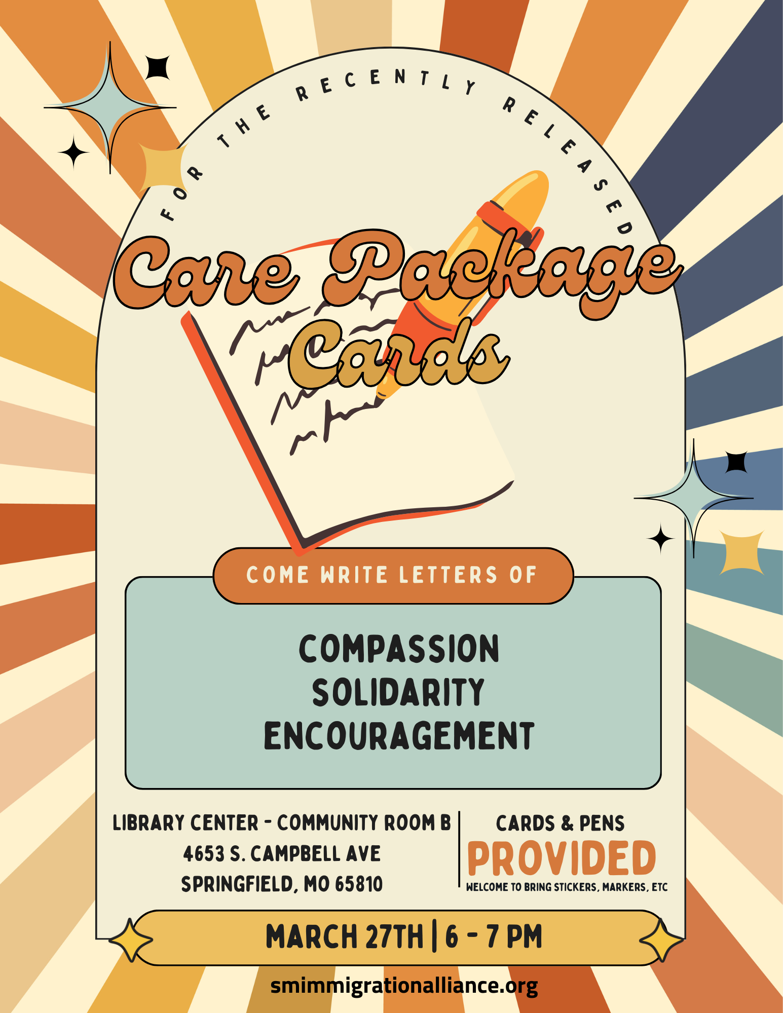 Come join us at the Library Center in Community Room B to write cards of compassion, solidarity, and encouragement to recently released ICE Detainees. SMIA has assembled care packages to support individuals recently released from the Greene County Jail so that they have access to toiletries, food, water, and other items of comfort. We want […]