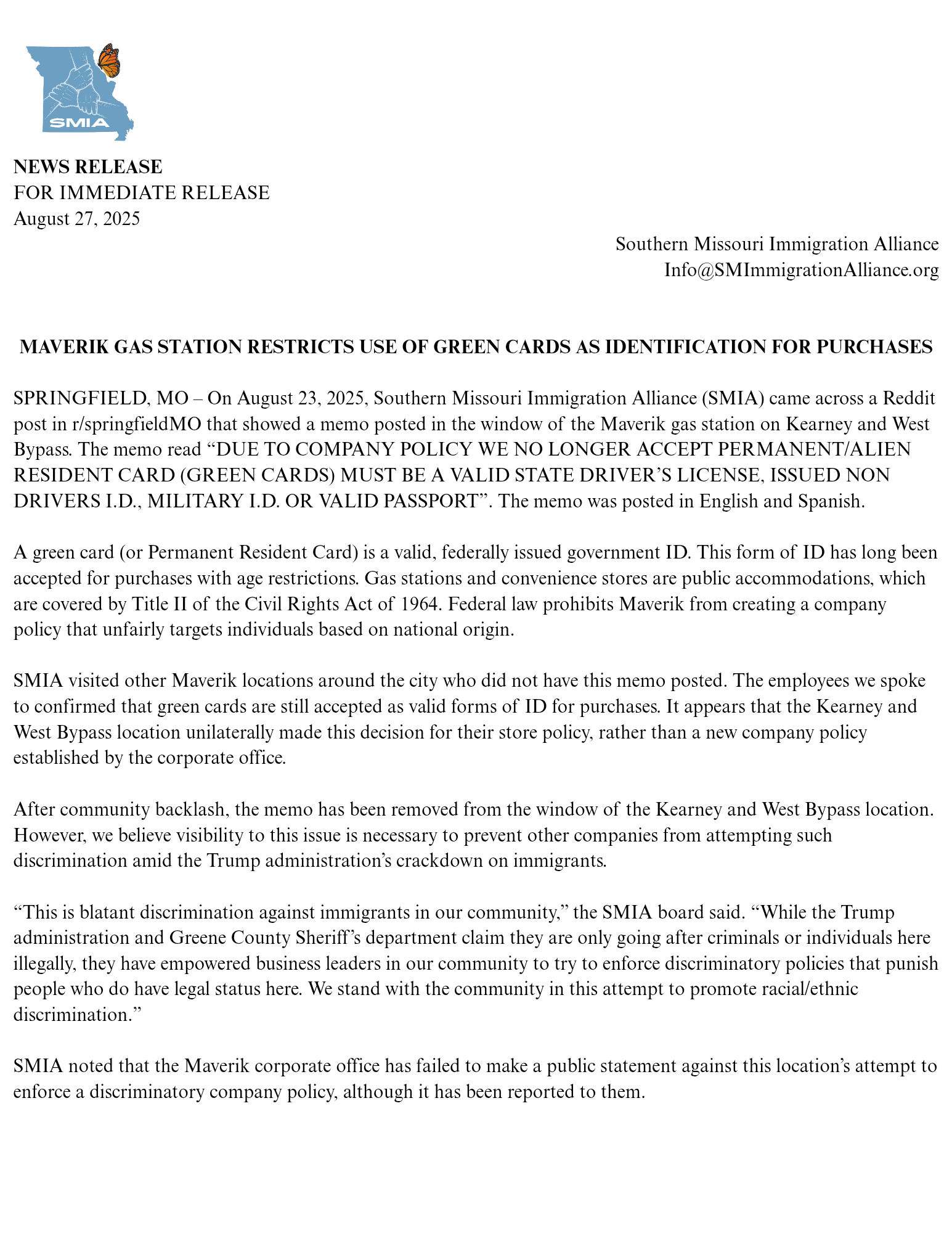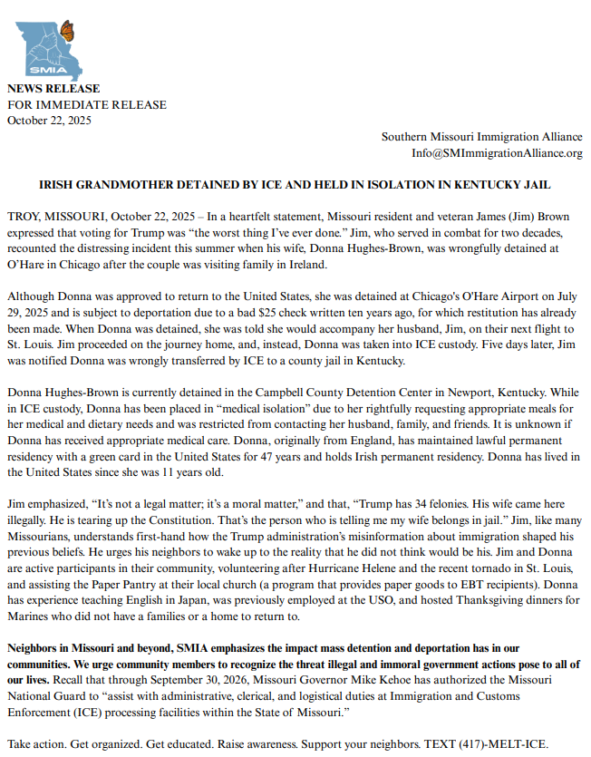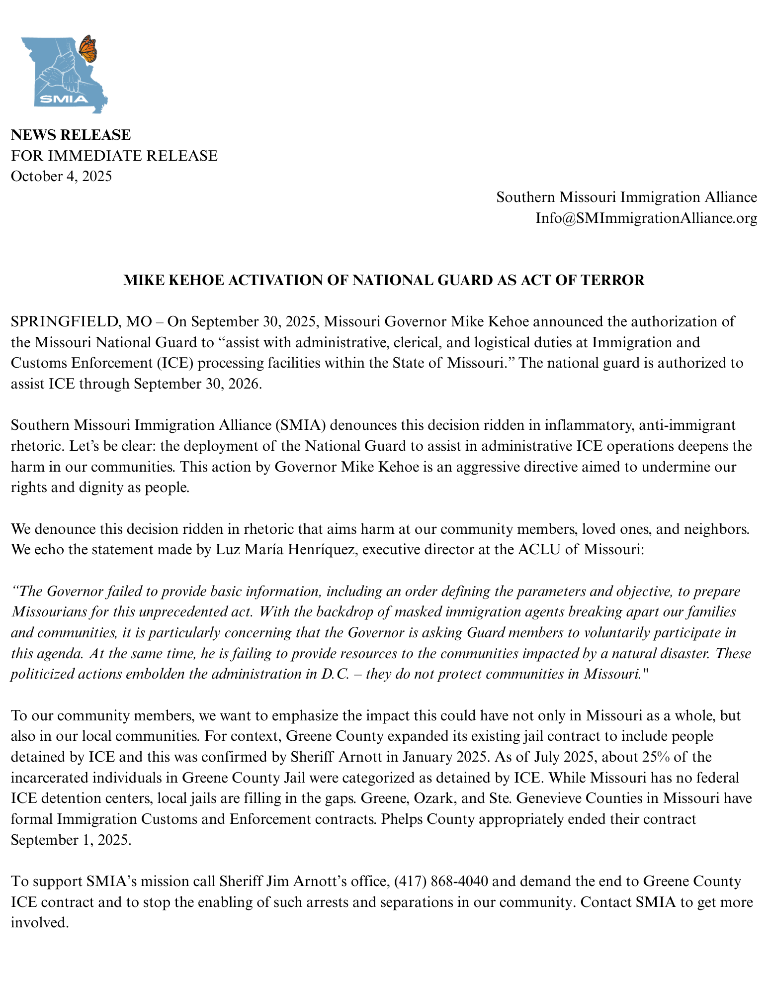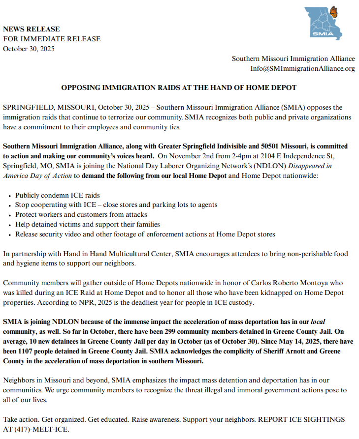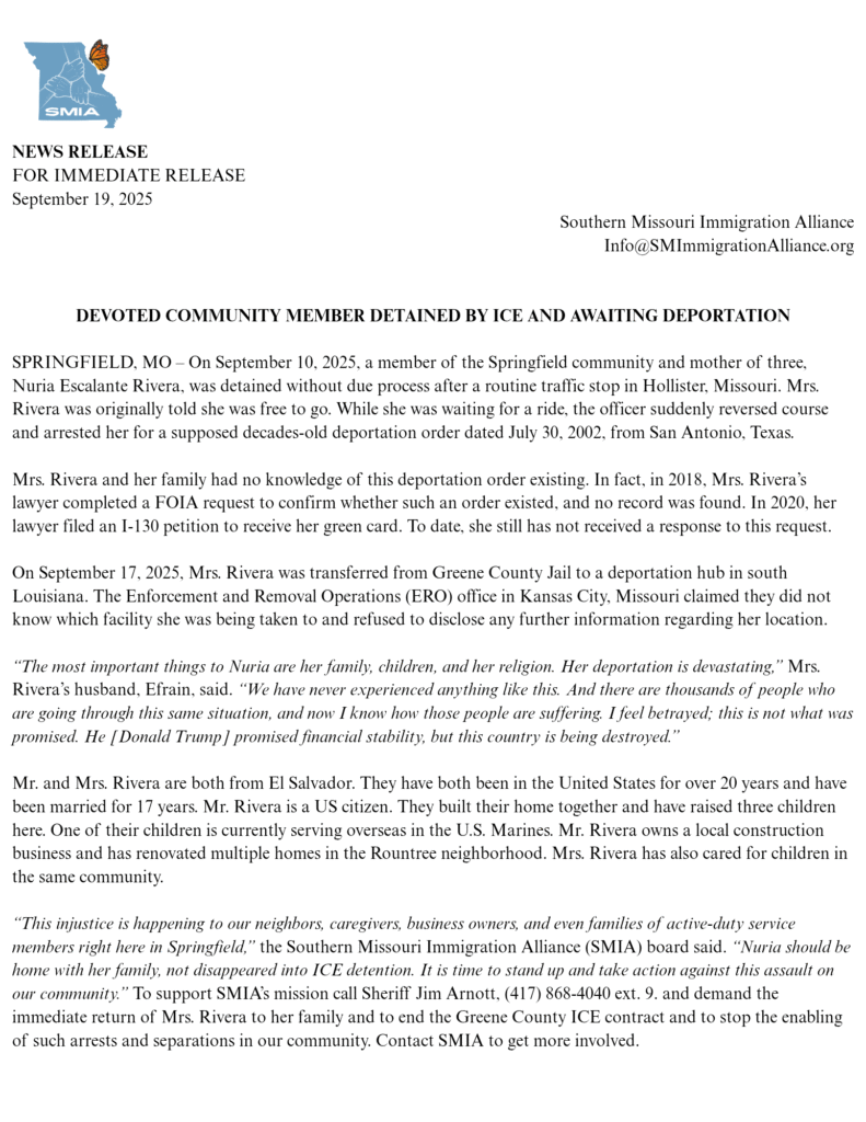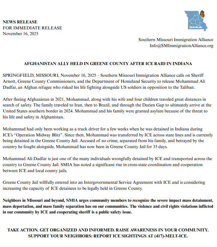 Press Releases Articles November 16, 2025 October 30, 2025 October 22, 2025 October 4, 2025 September 19, 2025 August 27, 2025 KY3: Group petitions Greene County Commission to end contract with ICE and the Greene County JailKY3: Alliance helps detained immigrants with legal resources and community supportOzarks First: Springfield restaurant owner pleads guilty to hiring undocumented employees